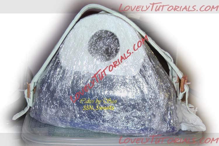 You can thread though the buckles now or after the wire is bent and put on the home-made handle holder to get the conical shape that I wanted. Be very careful when doing this otherwise the ends might come off in your hands. To bend the wire, hold the end of the wire and bend ( don't press on the fondant/gumpaste) also bend the wire near where the buckles will be slightly so that exposed wire is partially vertical when going into the cake ( see pic above).