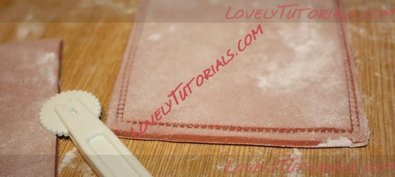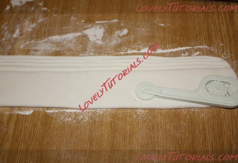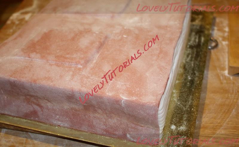 3. Мастику немного окрасила в кор цвет, так потом легче будет сверху красить, из кусочка белой сделала как бы стопку бумаг( предварительно померила длину и высоту торта,сделала запас, раскатала в прямоугольник 4 -5 мм, роликом не слишком глубоко сделала полоски, ту часть, что на подгибку тонко раскатала и приладила к торту.