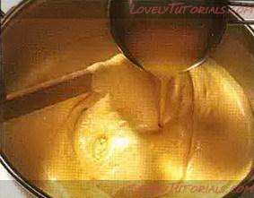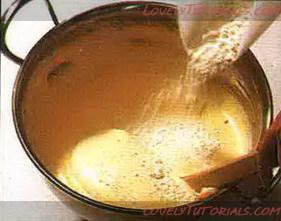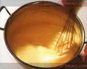 Яйца, яичные желтки, сахар и цедру лимона взбивают на водяной бане до образования пены и полного растворения сахара. Масса должна быть при этом теплой, но не слишком горячей.