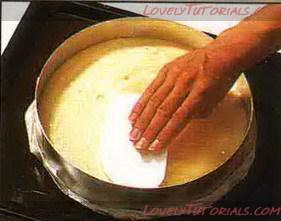 Установить съемное кольцо формы сверху пергаментной бумаги. Наполнить форму тестом и разровнять поверхность.