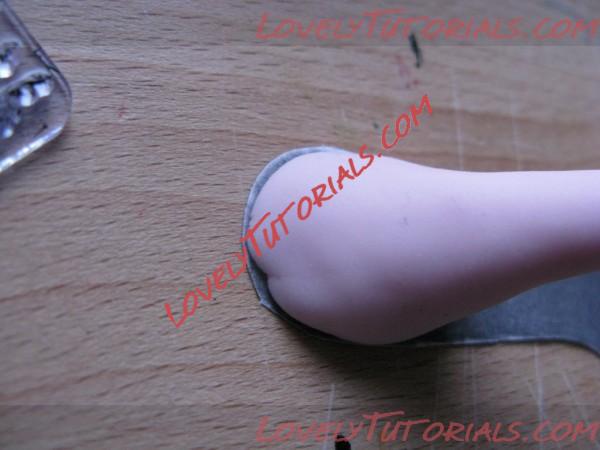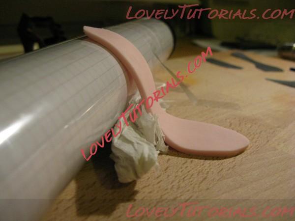 Roll out sugarpaste to 3 mm thickness. Use the exacto knife to cut out the sole and place it on the cylinder to shape it. Use tissue if additional support is needed.