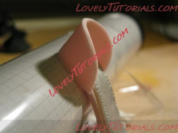 From the same piece of fondant, cut out five ruffles and place them in a plastic bag to prevent them from drying too quickly. Take out one ruffle at a time and stitch along the edges using star tool. Place a straw across the ruffle and fold the ruffle over it. Glue the ends together and put it in the bag again (don’t remove the straw), repeating the procedure with all five pieces. For the last ruffle, stitch another line like in the picture.