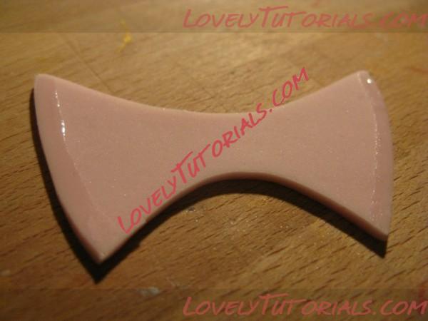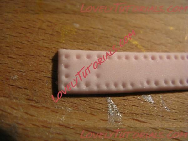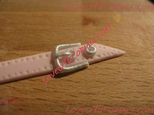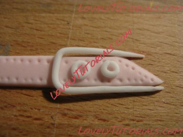 Roll out sugarpaste (of the same color as the other strap) to 1-2 mm thickness, and cut out the top strap. Make a stitching along the edge and like in the picture.