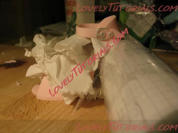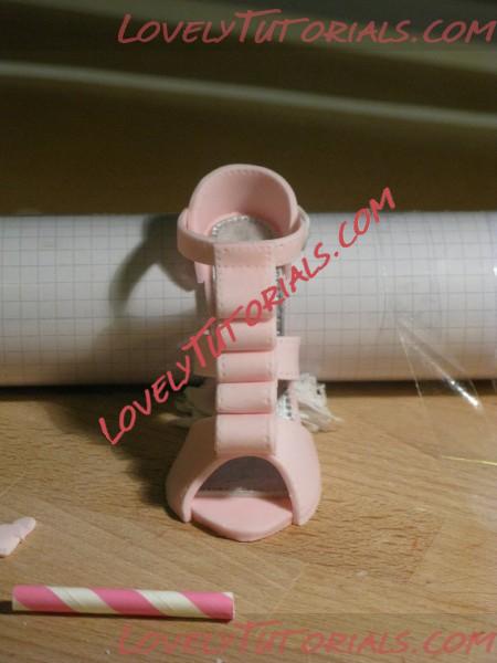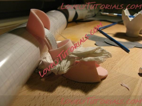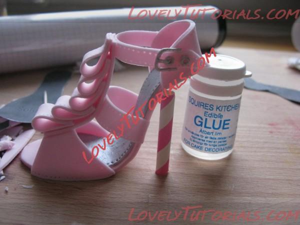 Attach the strap using edible glue, supporting it with tissue. Make sure the strap is horizontal! Leave to dry overnight before moving on with adding the ruffles and heel.