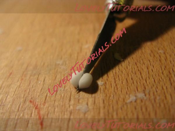 Roll a tiny ball out of white sugarpaste, approx. 4 mm in diameter. Cut it in half and roll into two new balls.