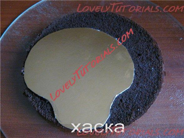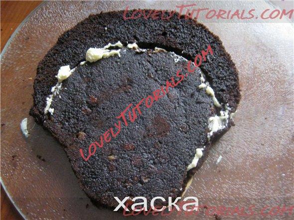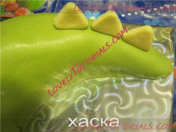Хочу обратить ваше внимание, что торт сложной составной формы, поэтому собирался он на подложке, на которой отдавался. Для того чтобы ее не испачкать использовала пергамент. Сделав в области хвоста надрез и вырезав дырку по форме туловища динозавра. Затем, когда динозавр был обмазан и собран, не составило большого труда извлечь эту бумагу.