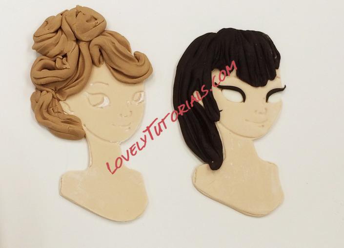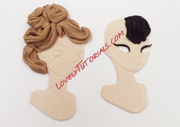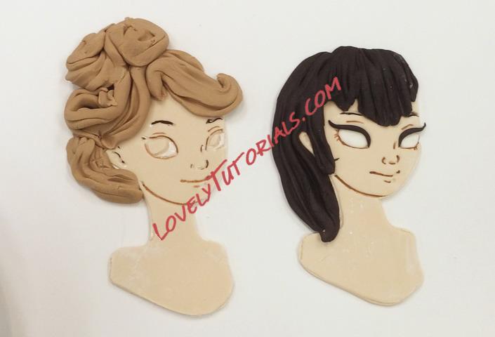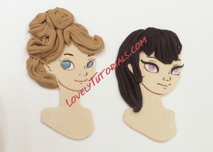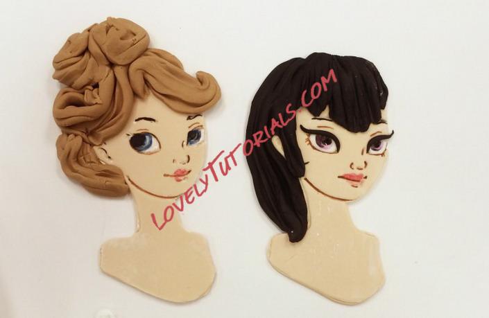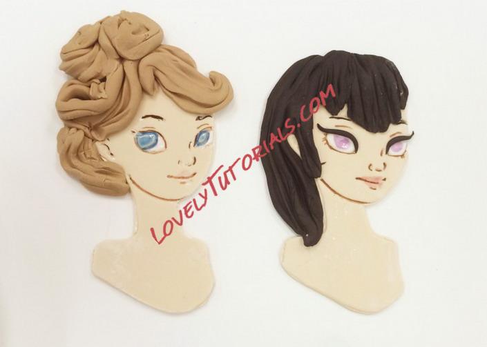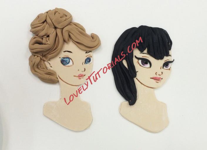 The figure on the left required me to paint in the whites of her eye. I used white gel food color for this. Make sure you shake the bottle first or it will be too thin to paint with. The irises are done with gel color also. Make sure you are thinking about where she is looking when you paint the eyes in! The character on the left has guides but the one on the right was a bit more challenging.