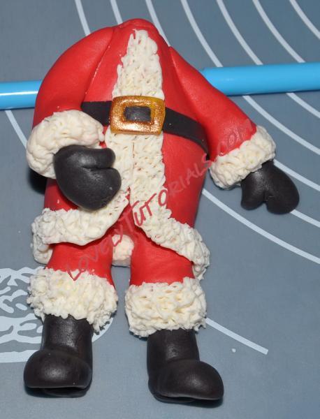 3) Раскатываем пласт красной мастики, оборачиваем вокруг будущего Санты, где нужно подрезаем и превращаем все это в шубу, на края прикрепляем жгутик из белой мастики, и затем "кудрявим" его