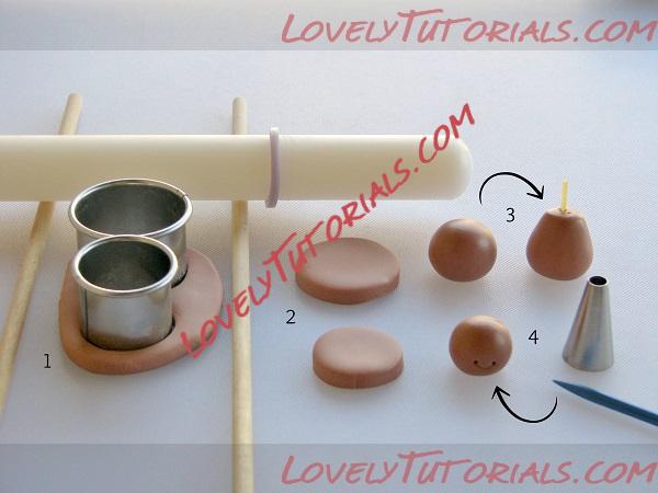 Roll out light brown fondant thick with the rolling pin and wooden dowels. Cut out two miniature circles with the round cutter.