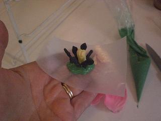Pipe some more chocolate dots on the three parts where the petals meet, right up against the center wire.