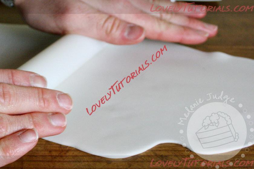 Step 1: Roll the fondant into a thin sheet, between 1/8 and 1/16 of an inch thick. You may need to lightly dust your work surface with powdered sugar to keep the fondant from sticking.
