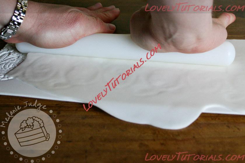 Step 6: Carefully lift the fondant off of the lace mold and place it on your work surface. If you do not see a clean, crisp lace impression in the fondant at this time, re-knead the fondant and start again.
