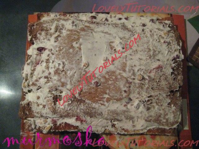 Этот прямоугольный кусочек немного с верхнего края вдавливаем в крем, а нижний край подгибаем весь под торт.