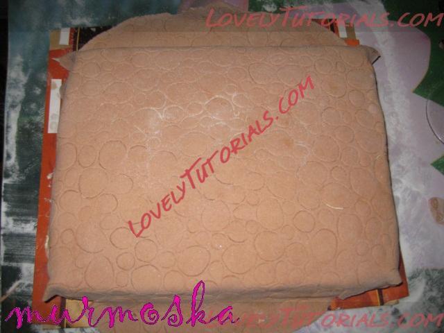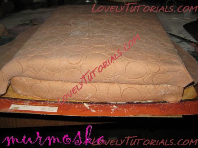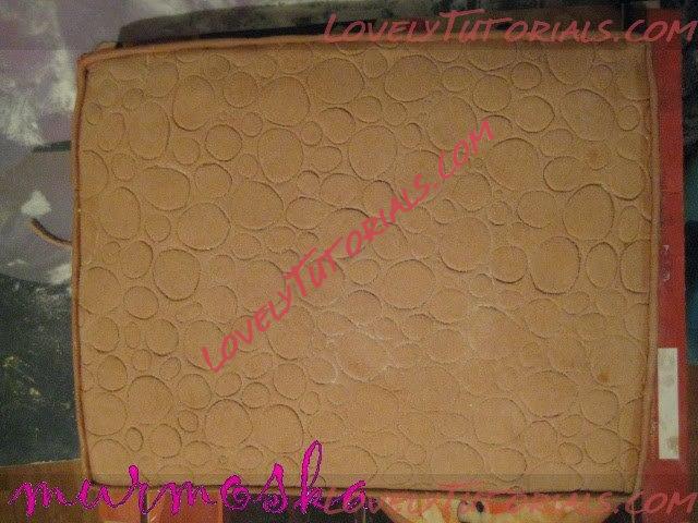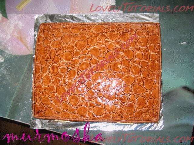 И так из коричневой мастики вырезаем прямоугольник, наносим на него наш узор из крокодиловой кожи и прикладываем к половине боковины – будем делать нижнюю часть чемодана. Вот фотографии: