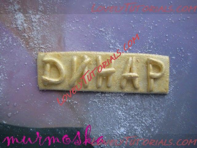 Все наши детальки для чемодана позолотим кандурином, который я разводила в водке, чтобы проще было нанести на мастику. Из остатков мастики решила добавить еще и логотип своему чемодану – Имя именинника – смотрите что у меня получилось.