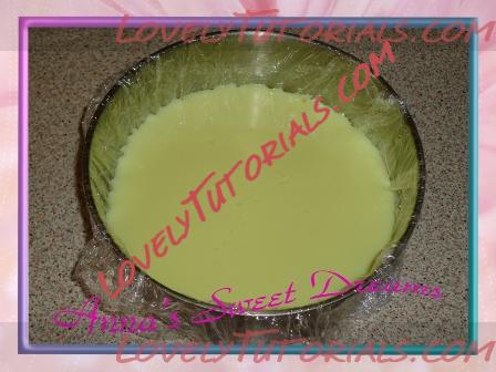 Форму застилаем кухонным целофаном. На дно помещаем корж карамельного бисквита.