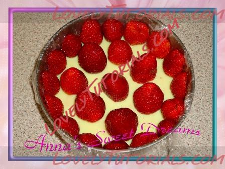 Заливаем суфле в форму так, чтобы вся клубника была не видна. Ставим торт в холодильник до полного застывания суфле.