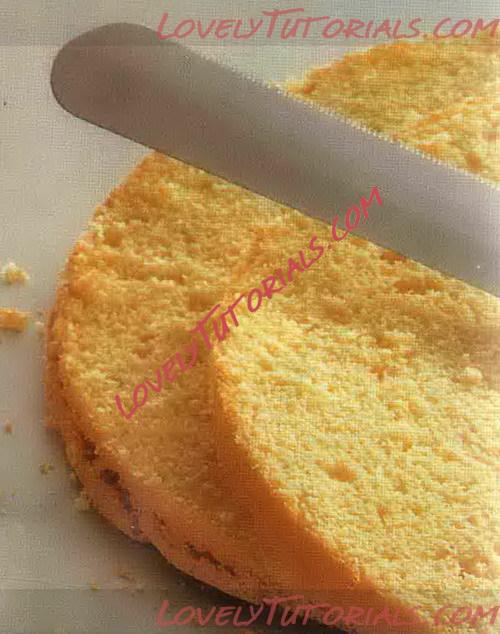 Разрезать корж по горизонтали на 2-3 части равной толщины. Использовать нож с волнообразной заточкой.