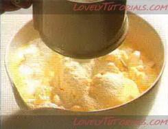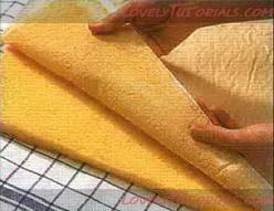 Яйца, желтки, сахар и цедру лимона взбить на водяной бане, как показано на фото. Для этого поставить кастрюлю в сосуд с теплой (не горячей) водой и взбивать массу на небольшом огне. Затем снять кастрюлю с водяной бани и готовить, как показано на фото. Готовый корж немного охладить и опрокинуть на доску, слегка посыпанную мукой, затем осторожно снять бумагу и отделить кольцо.