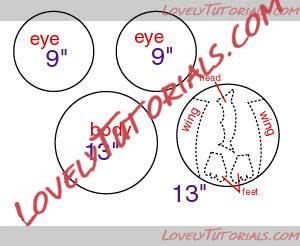 The two 9" round cakes are the eyes and one of the 13" round cakes are the body. The other 13" round cake you cut into your wings, feet, and top of head. Here is what it looks like before iced.