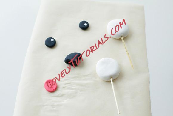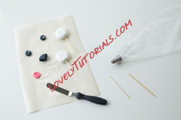 Create your fondant pieces to make the eyes, nose, tongue, and ears. To make the ears, roll two balls of white fondant and squash them down into thick circular patties. Cut a wooden BBQ stick evenly in two and insert into patties to make ears. Using the black fondant, shape the eyes and nose. Using the pink fondant, roll a small ball, squash it down into a patty and gently pull it into an oblong tongue-like shape. Use a knife to create a divot in the tongue.