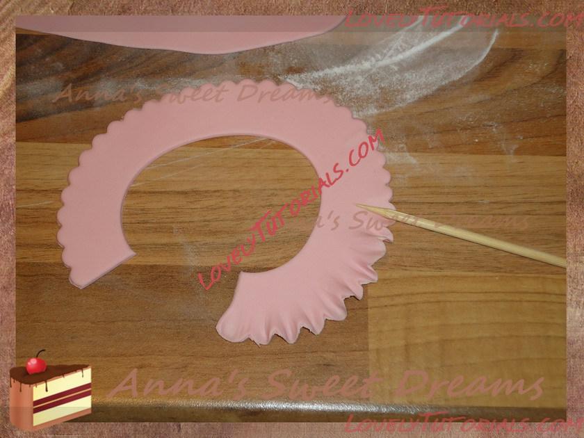 Из мастики розового цвета вырезала круг для рюши. Шпажкой прокатала края. Закрыла этими рюшами нижний срез на торте.