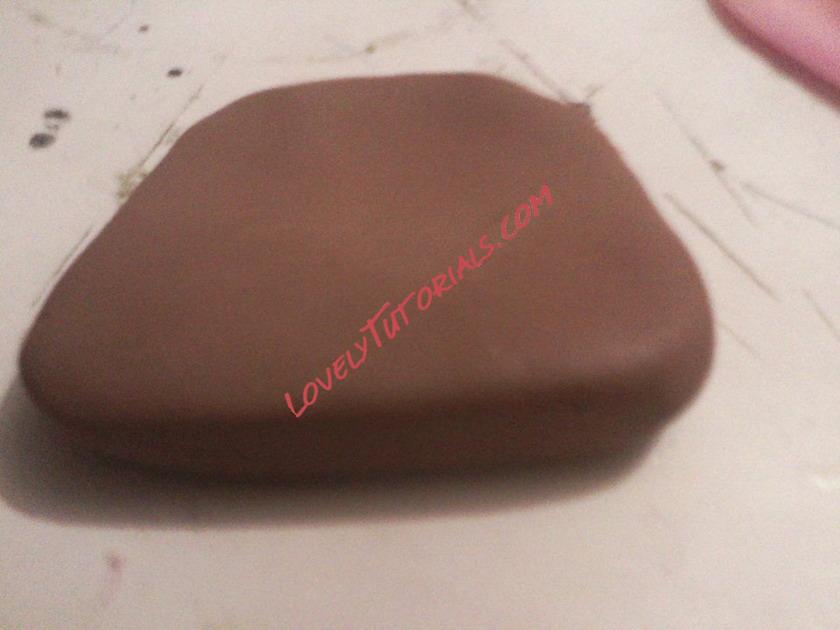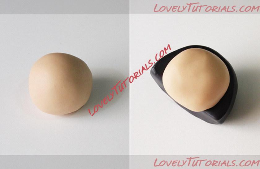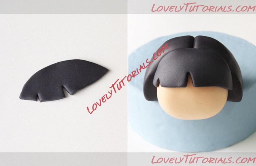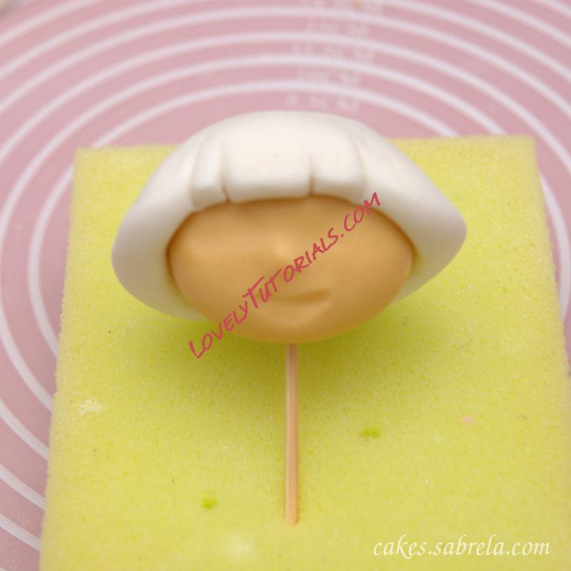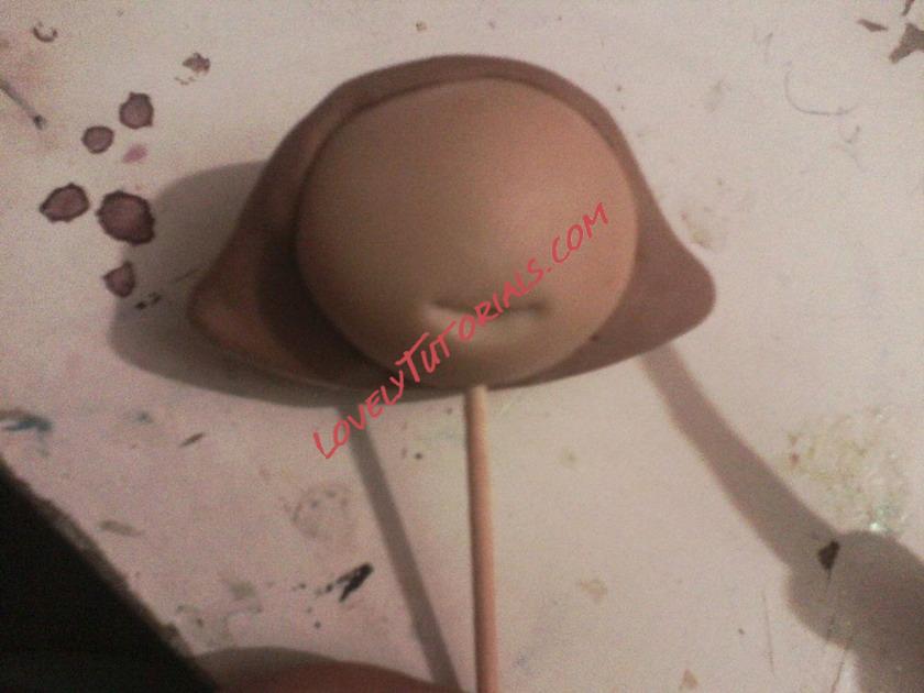 1. Голова и волосы. Из светло-коричневой мастики лепим овальную голову. Формируем носик. делаем углубления под глазки, продавливаем улыбку. Оставляем сохнуть.Когда голова достаточно высохла и держит хорошо форму, можно делать волосы. Довольно толстым слоем раскатываем кусочек мастики. Слой должен быть 4мм. Оборачиваем мастику вокруг головы и подрезаем челку. Нижний край волос слегка подкручиваем наружу. Прорисовываем прядки волос. Оставляем сушиться.