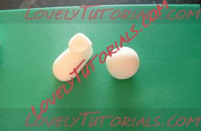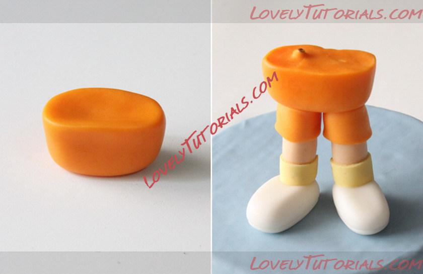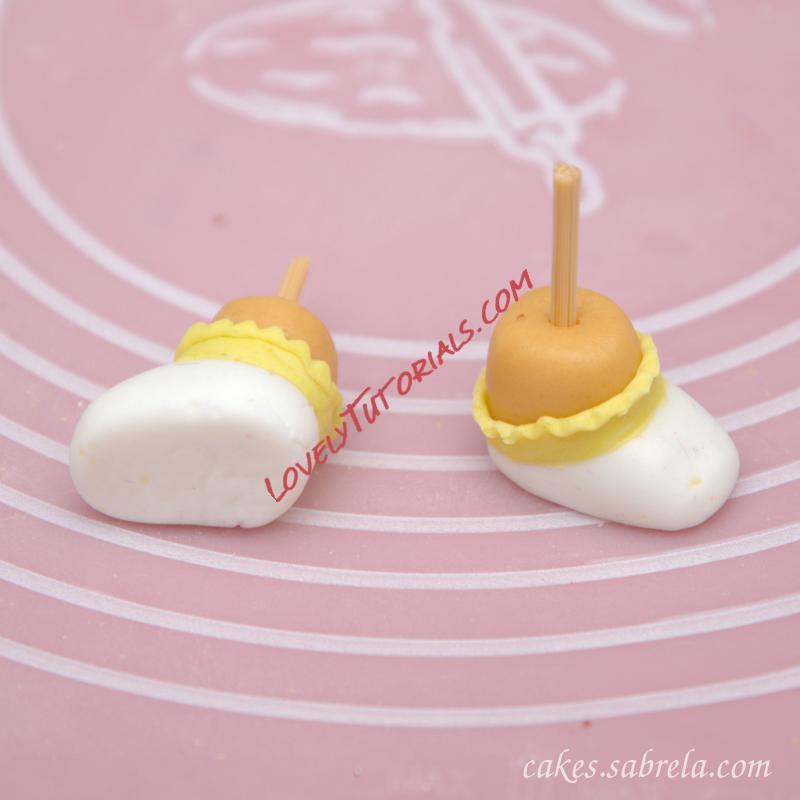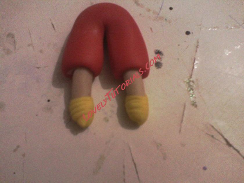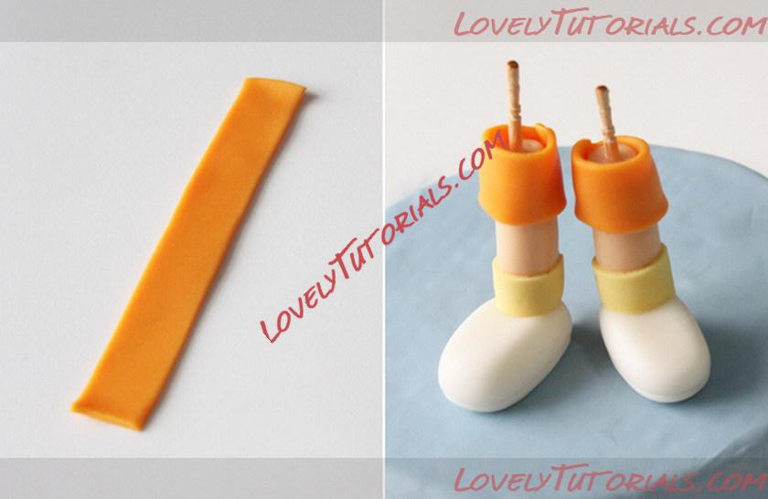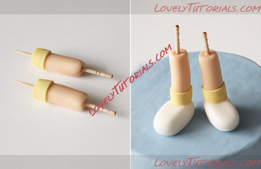 3. Ножки. Из белой мастики формируем кроссовки. Вставляем в них цилиндры ножек из светло-коричневой мастики. Место соединения оборачиваем в узкую полоску тонко раскатанной желтой мастики. Зубочисткой или заостренным инструментом делаем по краю кружева получившихся желтых носочков. В центр вставляем пол зубочистки, смоченной в клее.Оставляем подсохнуть.