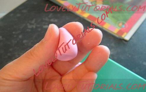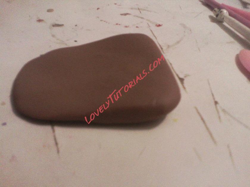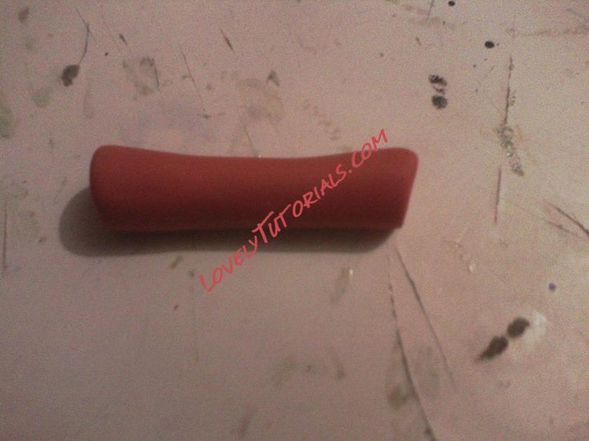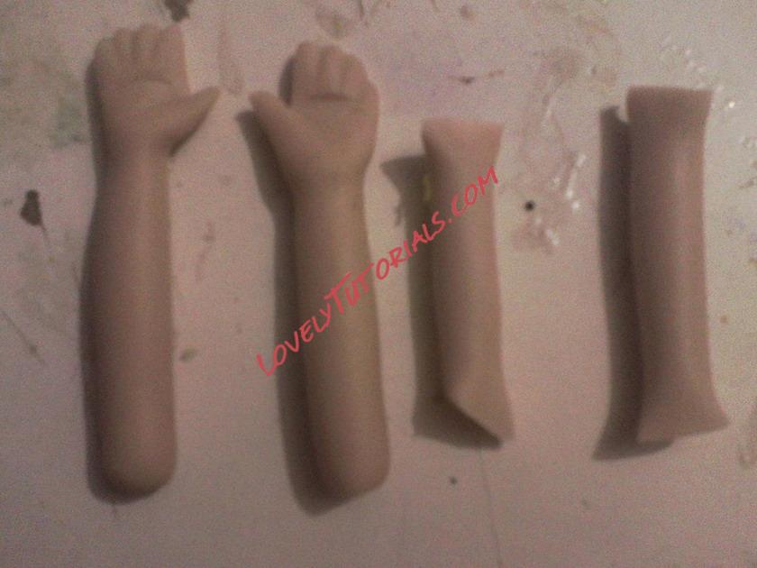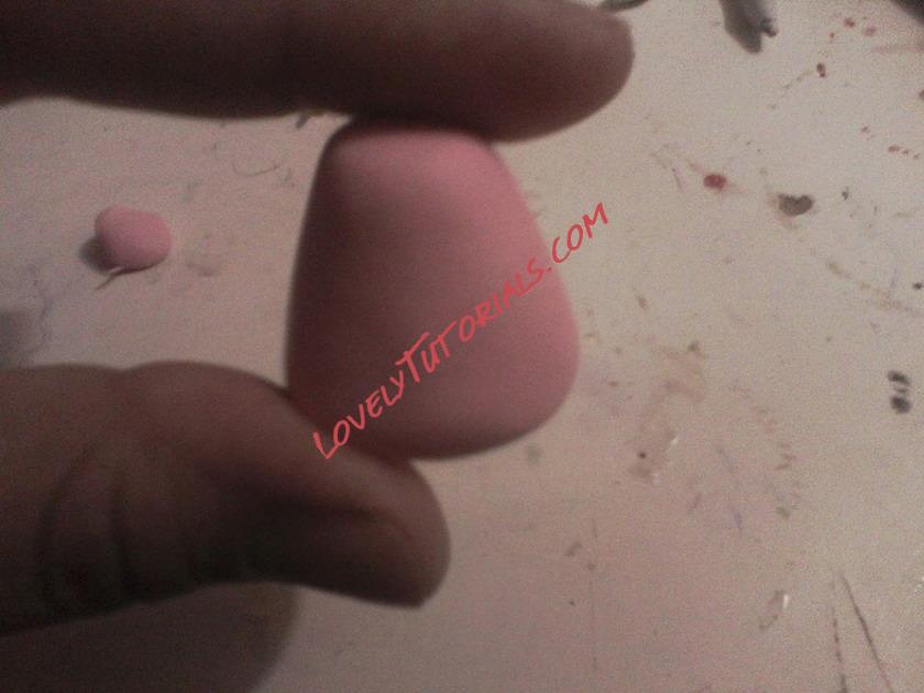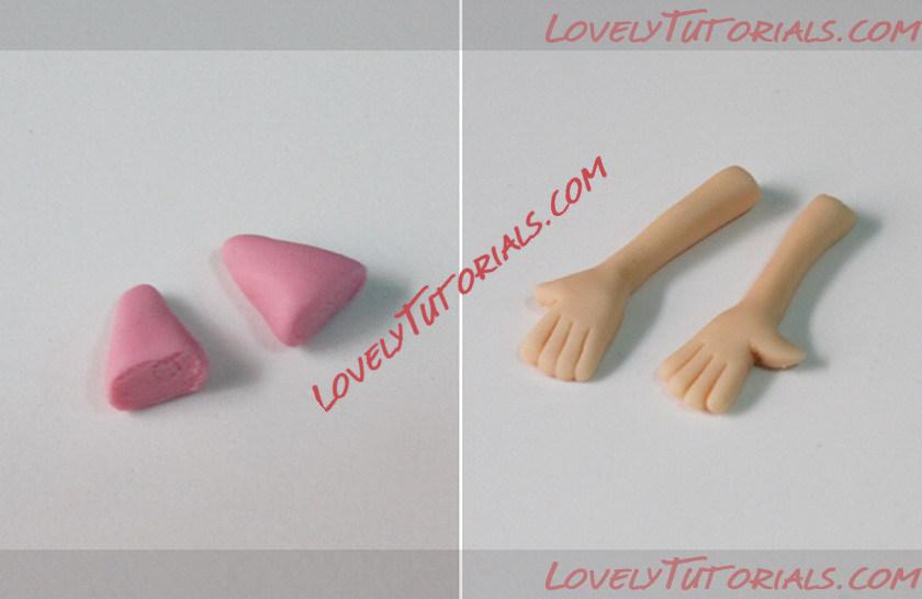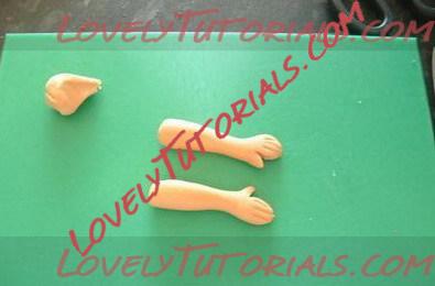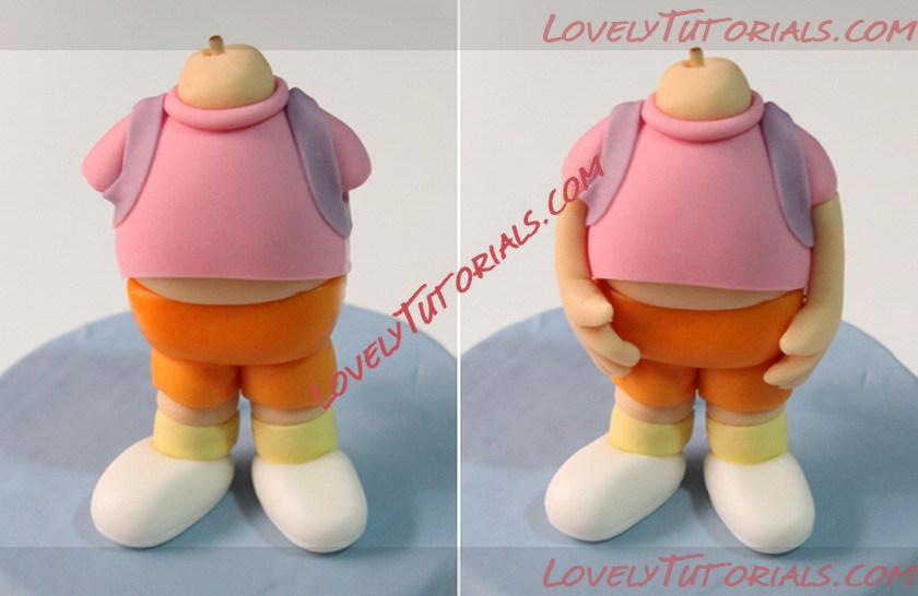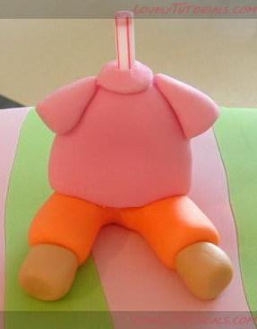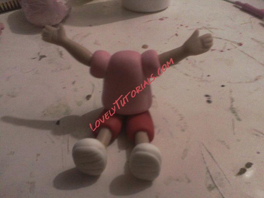 2. Тело и ручки. Из розовой мастики лепим футболку. К футболке приклеиваем оранжевые шортики и розовые рукава. Когда, детали достаточно крепко склеятся, можно приклеить ручки.