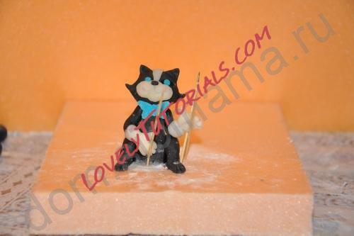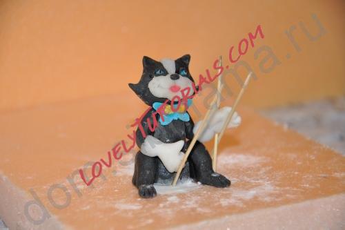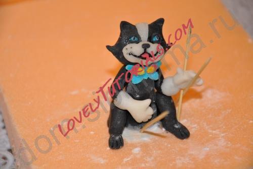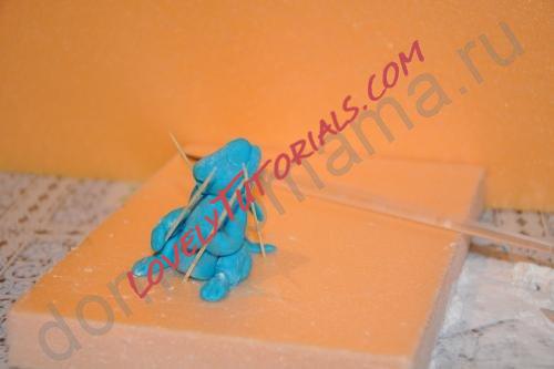 Клеим водичкой задние лапы, хвост, передние лапы в перчатках из белой мастики, их фиксируем зубочистками.