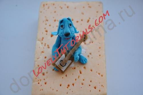 Из белой мастики делаем мордочку, пробор, вырезаем галстук-бабочку, приклеиваем глазки.