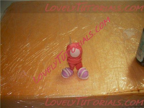 Прикрепляем (втыкаем) зубочистку в пенопласт. Смазываем СМС(разведенный клей) и к палочке крепим ножки.