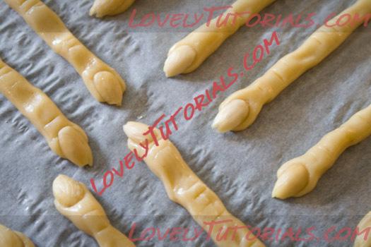 Take a small piece of cookie dough (walnut size) and roll it back and forth. You should make the finger long and thinly (think, witch long and creepy) for best results. Pinch and form knuckles. Score with a knife and transfer the fingers to the prepared baking sheet. Brush the cookies with the leftover egg white and place a almond “nail” on the cookie fingers. Chill for 15 minutes in the refrigerator.