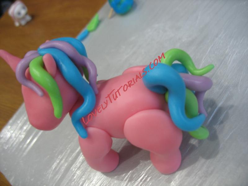 Делаем глаза - кому то удобней рисовать, мне проще сделать методом аппликации - из разноцветных кусочков мастики. Реснички конечно прорисовала черным гелевым красителем. Затем делаем из жгутиков радужные челку - красный, оранжевый, желтый; гриву - остальные