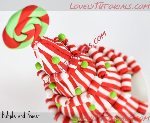 Make a fondant lollipop by rolling out a bright green and a red log of fondant about 20cm (8") long. Place the fondant together hold the ends and then twirl each end in the opposite direction so the twisted fondant looks like a rope. Gently roll a little with the palms of your hands to smooth out the 'rope' and then swirl the 'rope' around to make a lollipop shape (see picture). Place a wooden skewer into the base of the lollipop and allow to dry until firm.