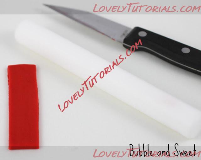 Roll out some of the red fondant until about 4mm thick and cut along rectangle strip (I made myself up a little cardboard template around 8cm X 2cm (3" X 3/4"), cut that strip in half longways and then do the same for the white.