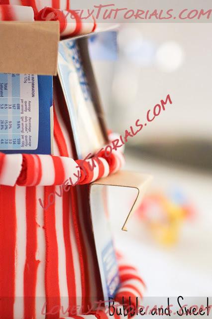 Fold up little pieces of cardboard to make support stands (see picture below for example). I made mine so that the lengths of striped 'candy' fondant were approx 1/4 the height of the cake so I ended up with 2 rows.)