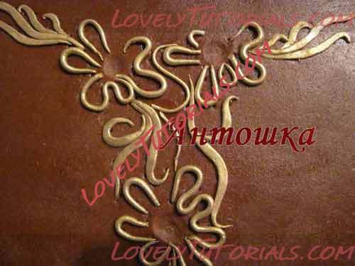 Берем вторую картинку (мы сделали 2 экз.). Кладем ее на торт и осторожно иголкой намечаем на мастике рисунок. Для этого не надо выписывать полностью листик, а лишь посередине наметить его изгиб. И также с остальными деталями колье. Вот что вышло