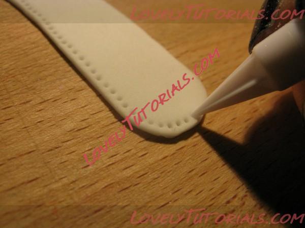 Roll out sugarpaste (of the same color as the other strap) to 1-2 mm thickness, and cut out the top strap. Make a stitching along the edge and like in the picture.