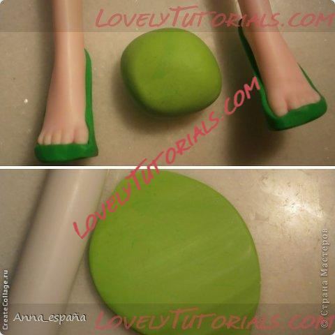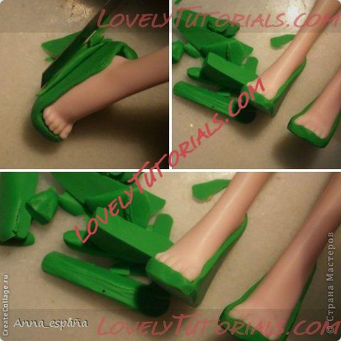 Прикладываем ленточку из пластики на носочную часть так как показано на фото. Надо чтобы не было видно пальчиков. Затем придавливаем немного к платформе и обрезаем концы ленты.