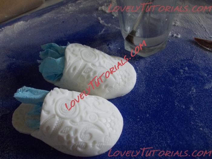 10. Носочкам дала хорошо просохнуть, добавила жемчижинки с помощью айсинга на верх стойки и по кончикам драпировки, затем закрыла "шов" между стойкой и драпировкой.. наклеив голубую полоску цв. пасты и добавив бантик. Последний шаг это перламутр, который нанесён с помощью аэрографа.... так сказать для блеска.
