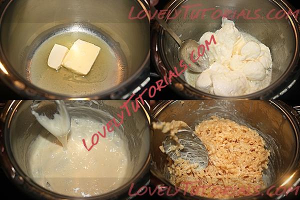 2. В кастрюльке хорошего размера растопить маргарин на среднем огне, добавьть маршмхеллоу и помешивая растопить их до жидкого состояния, затем быстро добавить рисовые хлопья, снять с плиты и быстро перемешать.