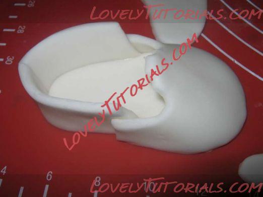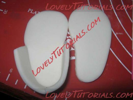 6. Затем я дала носочкам хорошо застыть ... просто оставила их на столе на ночь, но достаточно и нескольких часов. Подрезала слегка для придания нужной мне формы. Если вам нужна очень ровная поверхность, то лучше форму слегка отшлифовать и крупные отверстия залепить мастикой или цветочной пастой, а затем выровнять айсингом или ганашем, дать застыть и только потом покрывать мастикой или цветочной пастой ( гам пэйст ). Я работала с пастой, раскатала не очень тонко и положив носочек на пасту, вырезала контур подошвы и приклеила ( с помошью водички ) её на подошву носочка. Слегка подсушила и покрыла пастой сверху всю поверхность носочка