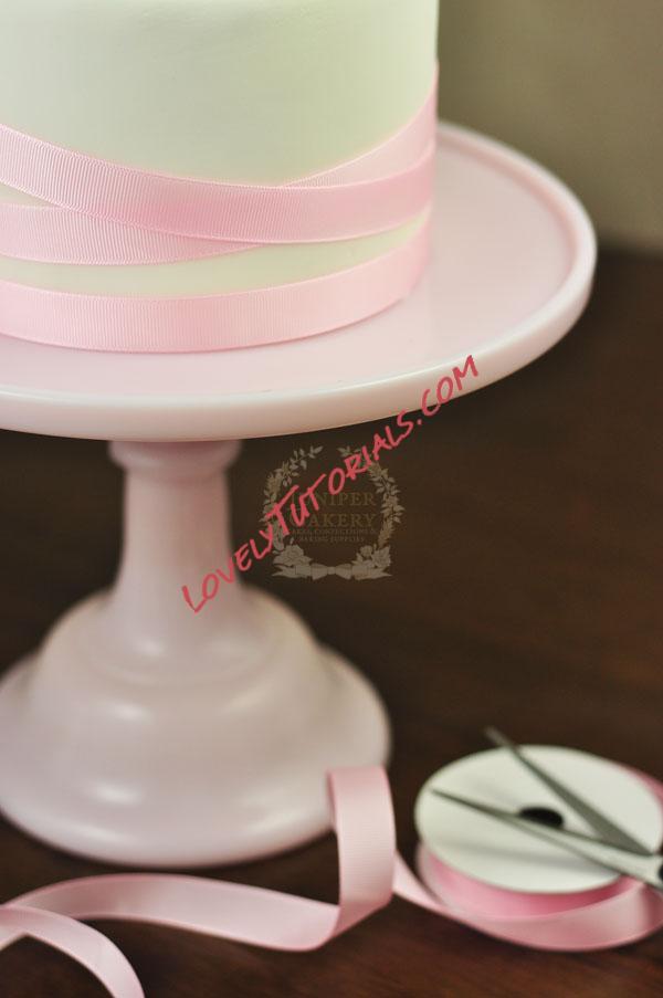 Take your covered cake and wrap some pink ribbon around to mimic the look of tied ballet slippers! We attach our ribbon down onto the cake’s surface with a little dab of royal icing or melted white chocolate to keep it firmly in place.