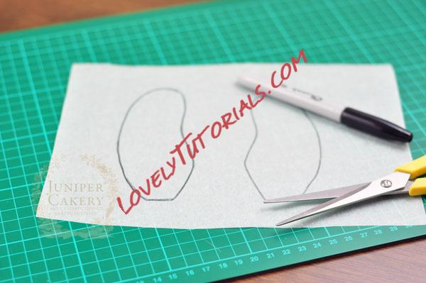 To make a pair of dainty ballet slippers begin with some parchment paper and a pen and work out a template. You can use a clean pair of children’s shoes to get a general shape of the soles, free hand sketch or use oval shapes to keep this step simple. For the outer pieces you will need a horseshoe shaped section longer and larger than the sole.