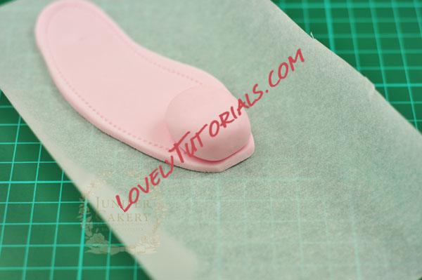 Paint edible glue around the outer edge of the soles and carefully drape and affix the upper section to the sole. Use some plastic wrap if desired to help pad out the slippers whilst they dry and set.