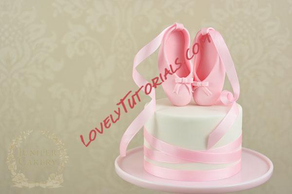 Finally, arrange and curl your ribbon around the slippers and cake for a pretty look. We generally wind ribbon around our fingers and hold for a few seconds to get a loose curl, but for more stubborn ribbon you can use a hair curling iron (be careful not to melt the cake or the gum paste ballet slippers though!).