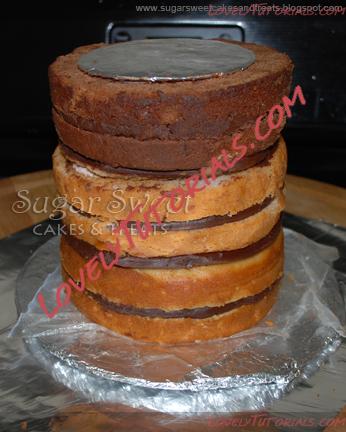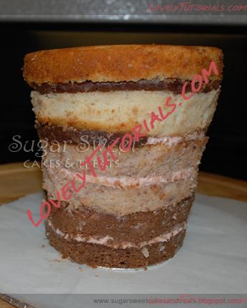I baked 3, 6" round cakes (each layer was 2" tall) with 5 layers of Strawberry Buttercream filling: Chocolate - Vanilla - Strawberry Sour Cream Cakes.