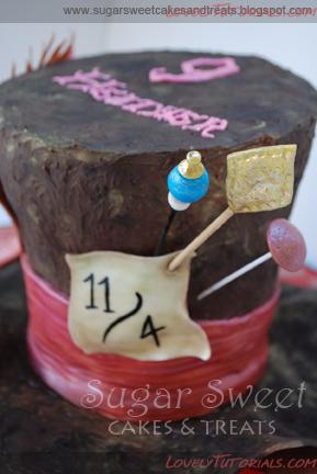 The entire hat and rim was dusted with patches of Dark Chocolate Brown Petal Dust and Avocado Luster Dust. The little trinkets were dusted with gold, pink, and white pearl dust and the modeling chocolate ribbon was dusted in pink pearl dust and painted with white gel colors. The stick holding the date is a skewer while the other 2 sticks (black and white) were dried pieces of spaghetti painted with gel colors. The feather was made out of fondant and dusted in various colors.