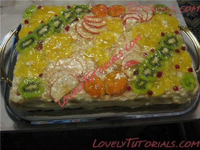 Суть: на листе пергамента рисуешь размер торта, смазываешь маслом. Тесто кладешь в кондитерский кулек (я в пакет молочный с тоненько отрезанным уголком)и выдавливаешь сначала контур толщиной теста 3 мм(толще не надо!), затем начинаешь заполнять середину - делаешь клетки 3х3 см, не больше! Выпекаешь в духовке при 180 град. до золотистого цвета, минут 20-25. В это время делаешь точно такую заготовку, но уже клетки делаешь по диагонали. Надо 4 коржа, 2 прямых, 2 косых. Затем их перемазываешь крЭмом и перекладываешь в пустые места кусочками апельсинов, мандаринов, ананасов и киви (что будет). Верх намазываешь кремом и на холод на ночь. Утром по крему красиво разложи тонкие срезы фруктов и залей крепким прозрачным желе (ну на крайняк лимонным)(я делаю готовую пачку желе Мрия львовское с половиной воды)- как желе начнет схватываться, сразу заливай и разровняй горячим плоским ножом. Ну очень красиво!!!